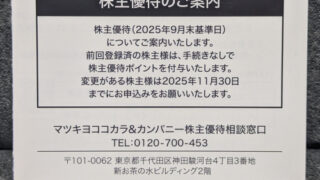 優待情報 3088 マツキヨココカラ&カンパニーの株主優待到着 3088はマツモトキヨシホールディングス → マツキヨココカラ&カンパニーへ変更となっています 2025年11月12日 優待案内到着 2025年9月末のマツモトキヨシホールディングス(3088)から株主優待が到着しました。 マツキ... 2026.01.24 優待情報