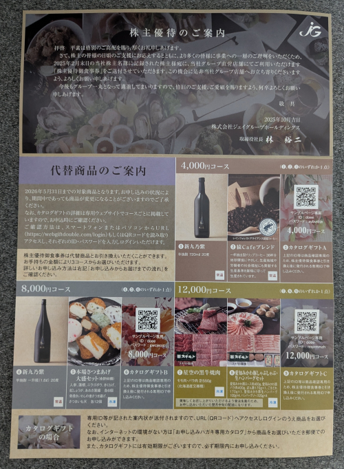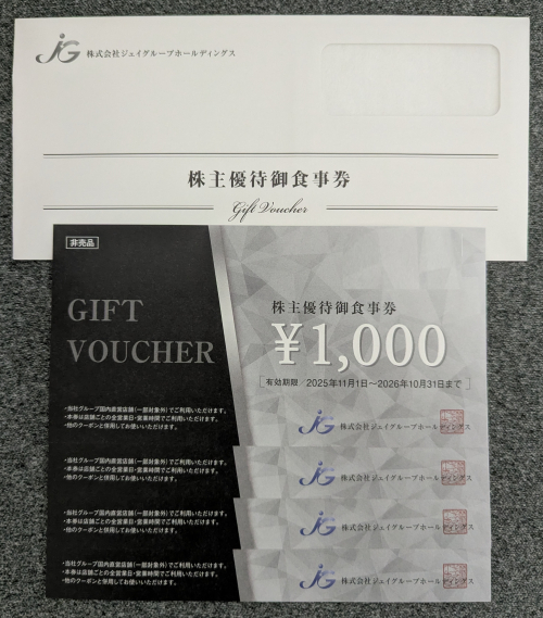 2025年8月末権利のジェイグループホールディングス(3063)から株主優待が到着しました。