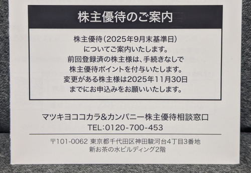 2025年9月末のマツモトキヨシホールディングス(3088)から株主優待が到着しました。