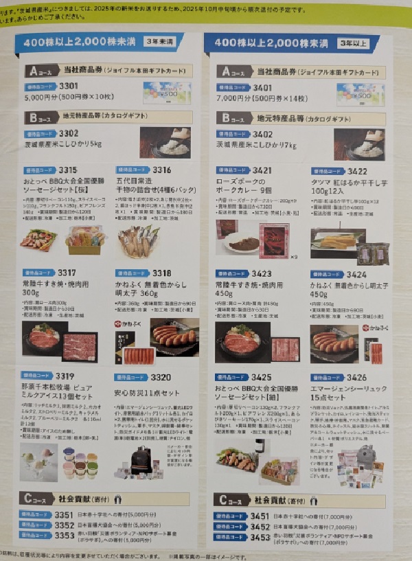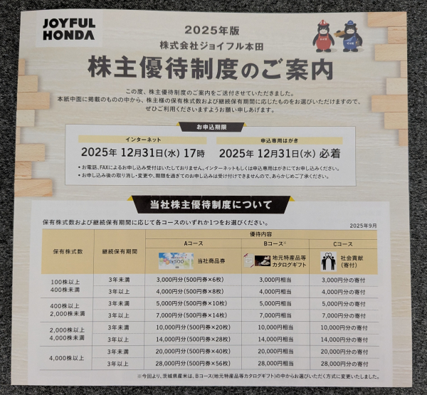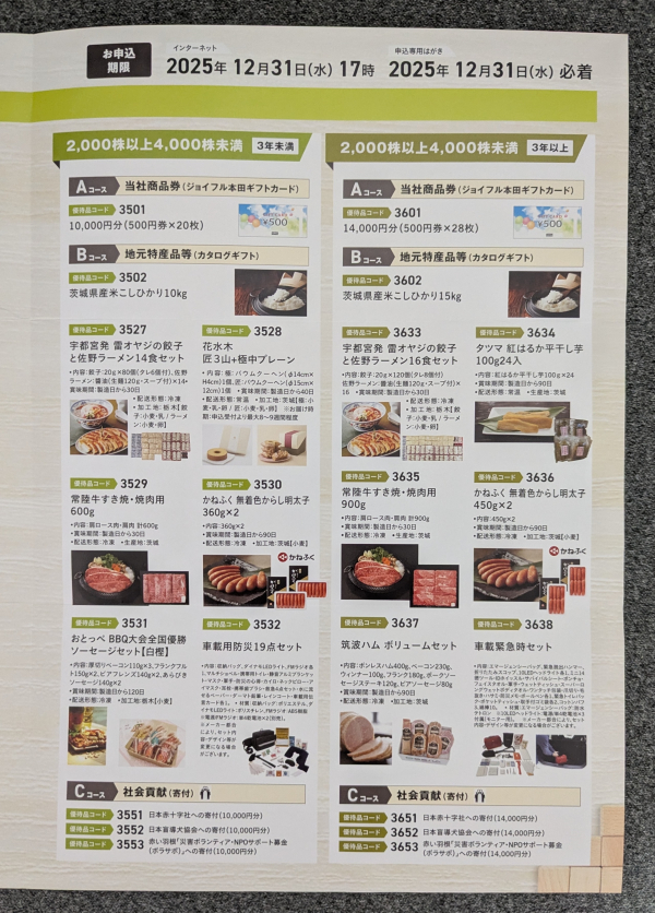 2025年6月20日権利のジョイフル本田(3191)から株主優待が到着しました。