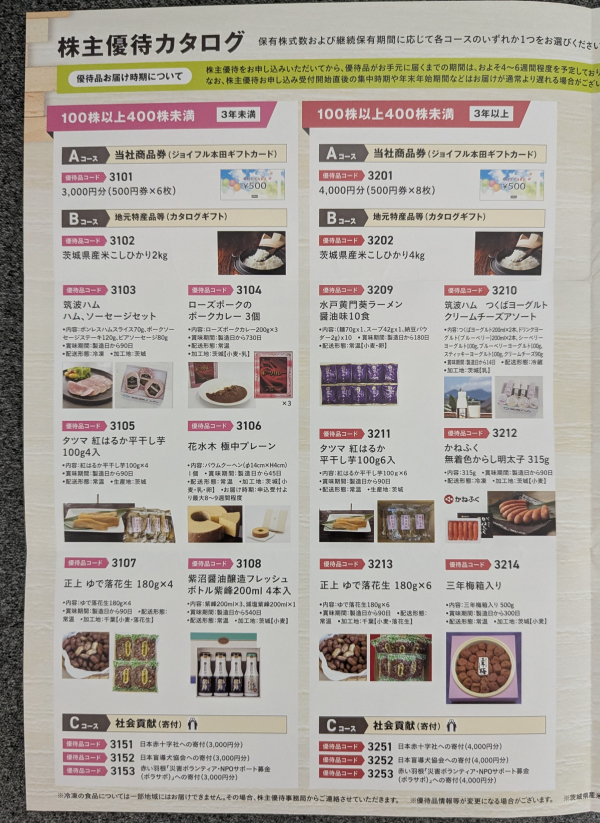 100株以上 ①2,000円分の商品券、②茨城県産米2kg、③カタログギフト2,000円相当、④社会貢献2,000円分