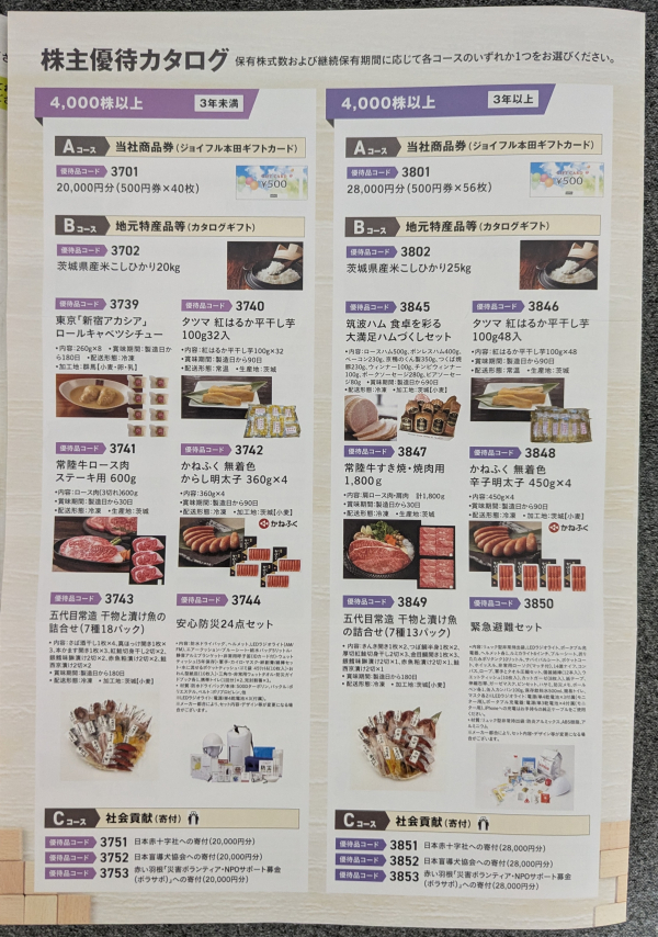 4,000株以上 ①16,000円分の商品券(32枚)、②茨城県産米20kg、③カタログギフト16,000円相当、④社会貢献16,000円分