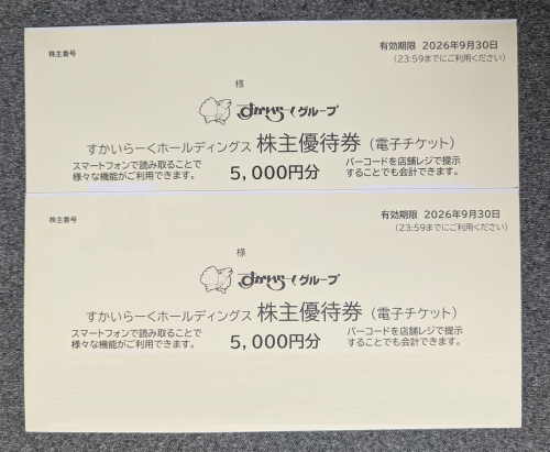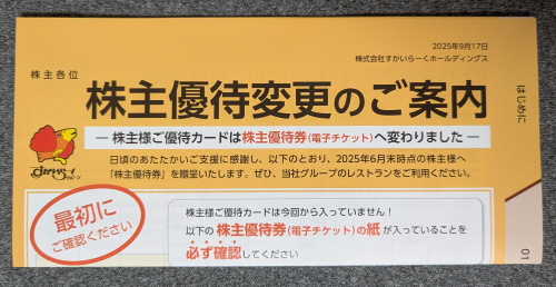 2025年6月末権利のすかいらーく(3197)から株主優待が到着しました