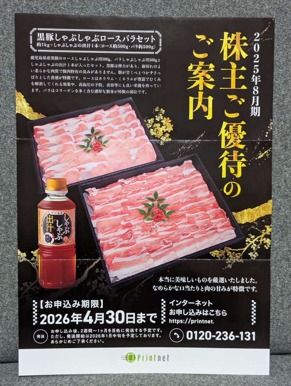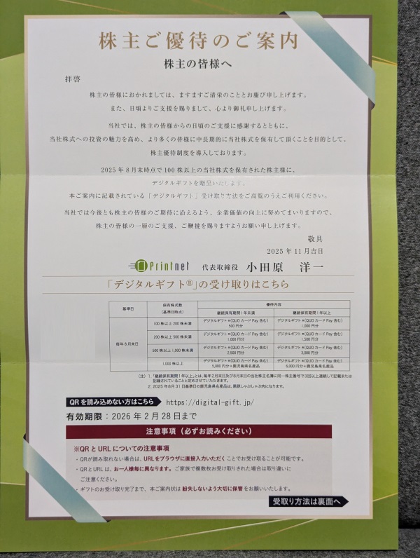 2025年8月末権利のプリントネット(7805)から株主優待が到着しました。