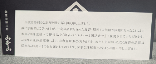 100株保有で山本山の海苔をいただきました。