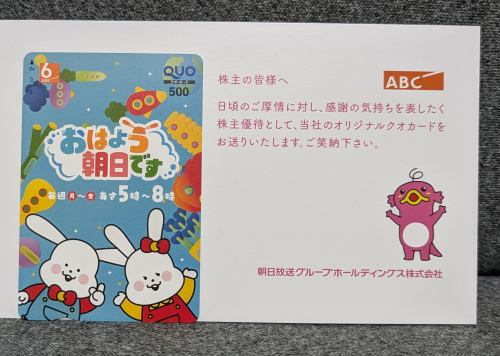 100株なので番組特製オリジナルクオカード500円分をいただきました。